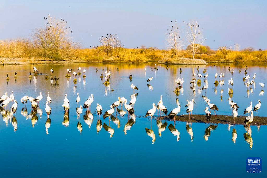 1月10日,鸟儿在江苏兴化里下河国家湿地公园内栖息、觅食(无人机照片)。新华社发(周社根摄)