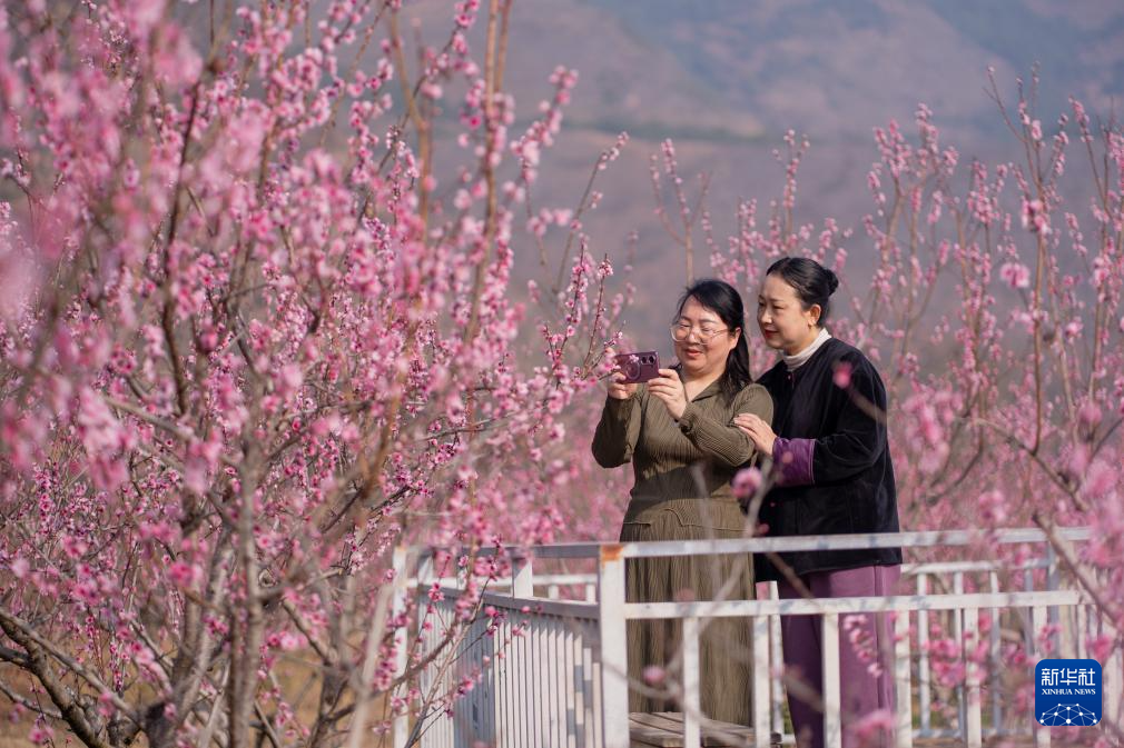 3月7日,在云南省大理白族自治州洱源县茈碧湖畔,游客在桃园赏花拍照。新华社发(罗新才摄)