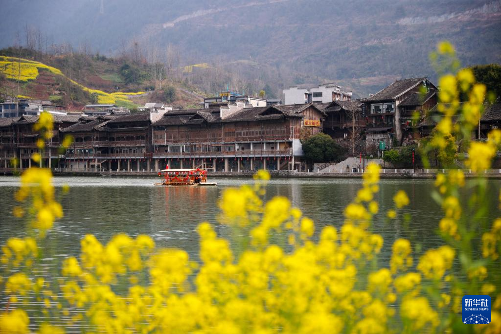 3月6日,游客在重庆市黔江区濯水古镇乘坐电动竹筏游览阿蓬江。新华社发(杨敏摄)
