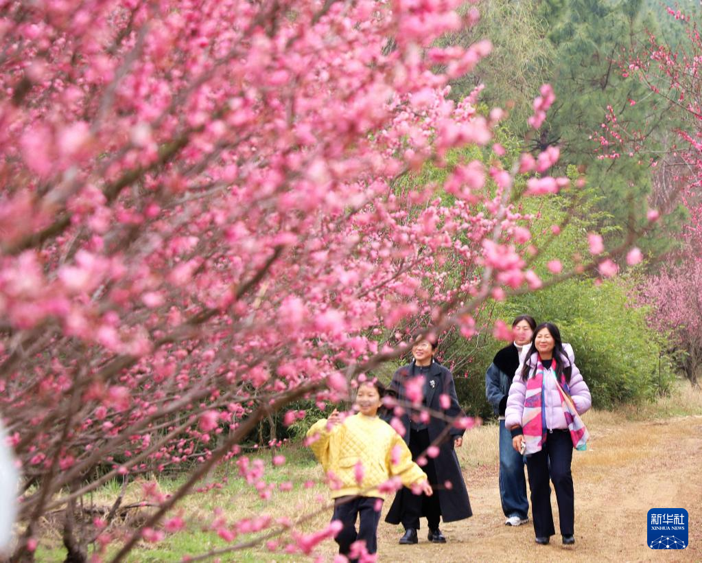 3月8日,在河南省南阳市卧龙区谢庄镇塔子山梅花基地,游客在赏景游玩。新华社发(高嵩摄)