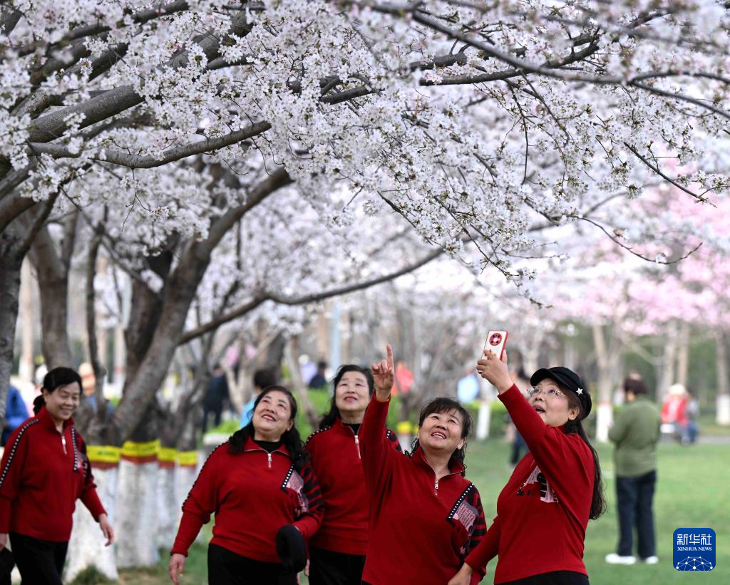 3月26日,游人在河北省石家庄市石津灌渠文化公园赏花拍照。新华社发(陈其保摄)