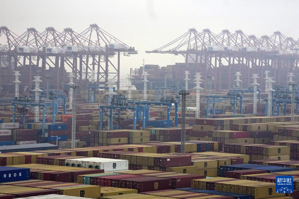 3月29日,卡车在宁波舟山港穿山港区集装箱码头装卸。新华社记者 黄宗治 摄