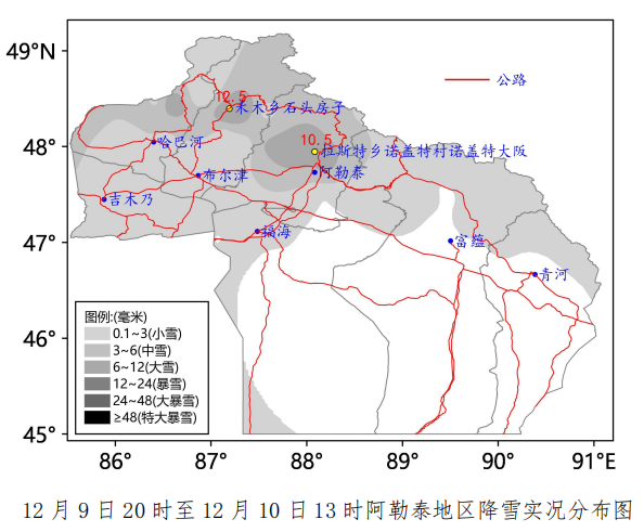 2025年12月9日20时至10日13时,阿勒泰地区普遍出现降雪天气,沿山及山区出现中到大雪。降雪量前10位的站点为:布尔津县禾木乡石头房子12.5毫米(暴雪),阿勒泰市拉斯特乡诺改特特村诺改特大阪10.5毫米(大雪),阿勒泰市将军山滑雪场9.7毫米(大雪),布尔津县禾木乡禾木售票站9.4毫米(大雪),齐巴尔希力克村9.1毫米(大雪),阿勒泰市拉斯特乡大东沟8.6毫米(大雪),阿勒泰市切木尔切克镇塑什喀布拉克村8.1毫米(大雪),阿勒泰市拉斯特乡小东沟鹊吉克桥7.8毫米(大雪),阿勒泰市阿拉哈克镇齐背岭水库7.0毫米(大雪),哈巴河县铁热克提乡6.6毫米(大雪)。
