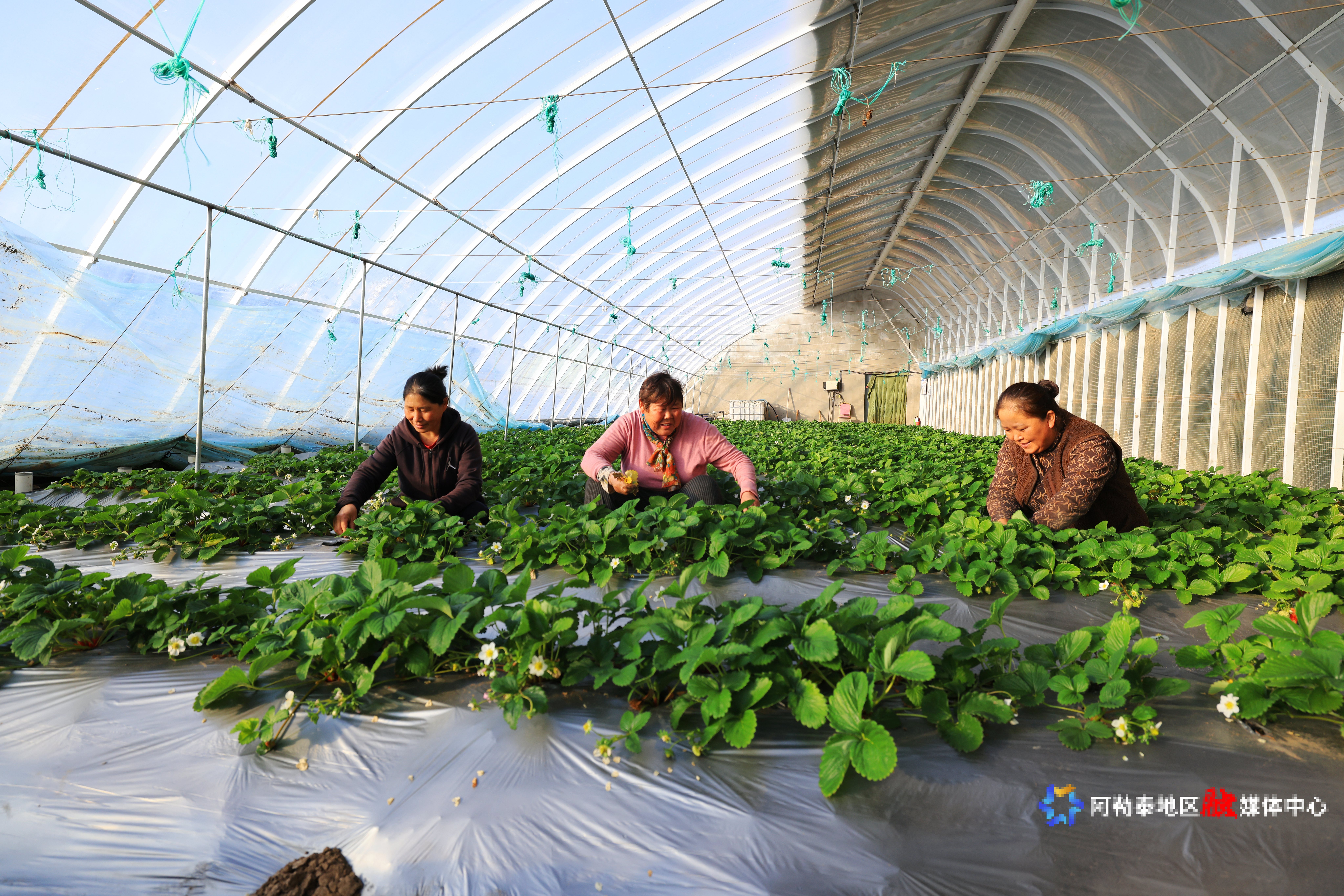1月5日,阿勒泰市拉斯特农业大棚内,工人们展示成熟的草莓。