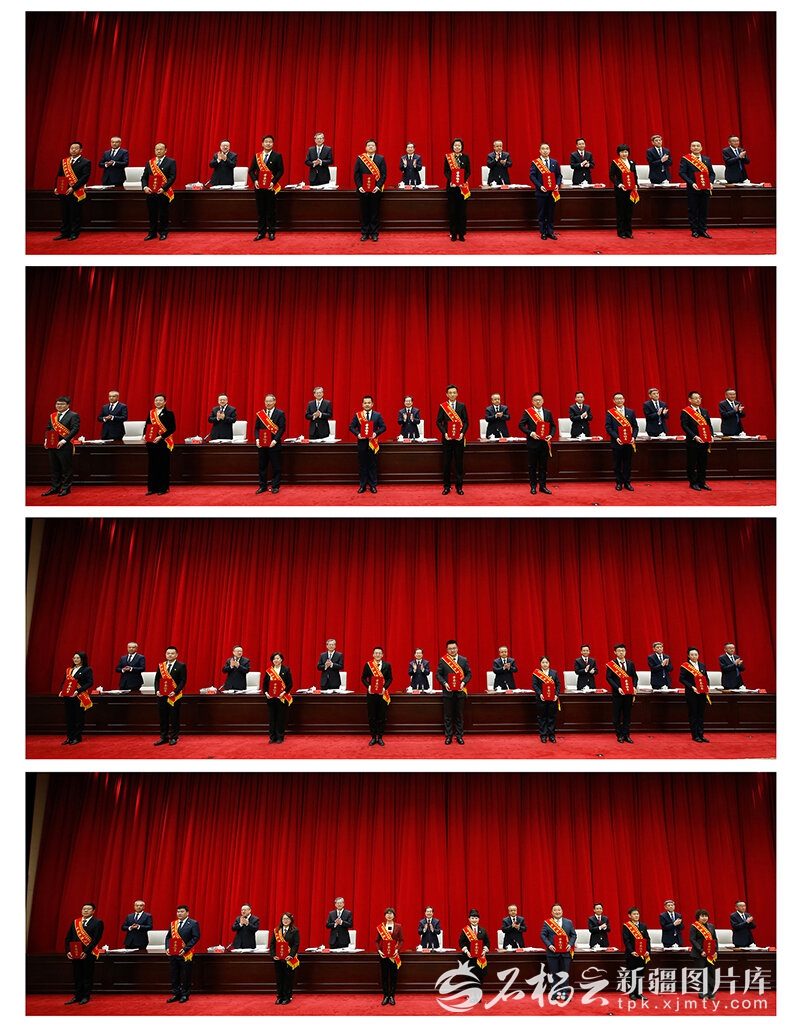 会上,自治区党委书记陈小江,自治区党委副书记、自治区主席艾尔肯·吐尼亚孜等领导为获得“新疆杰出人才奖”的代表颁发荣誉证书。石榴云/新疆日报记者 谢龙摄