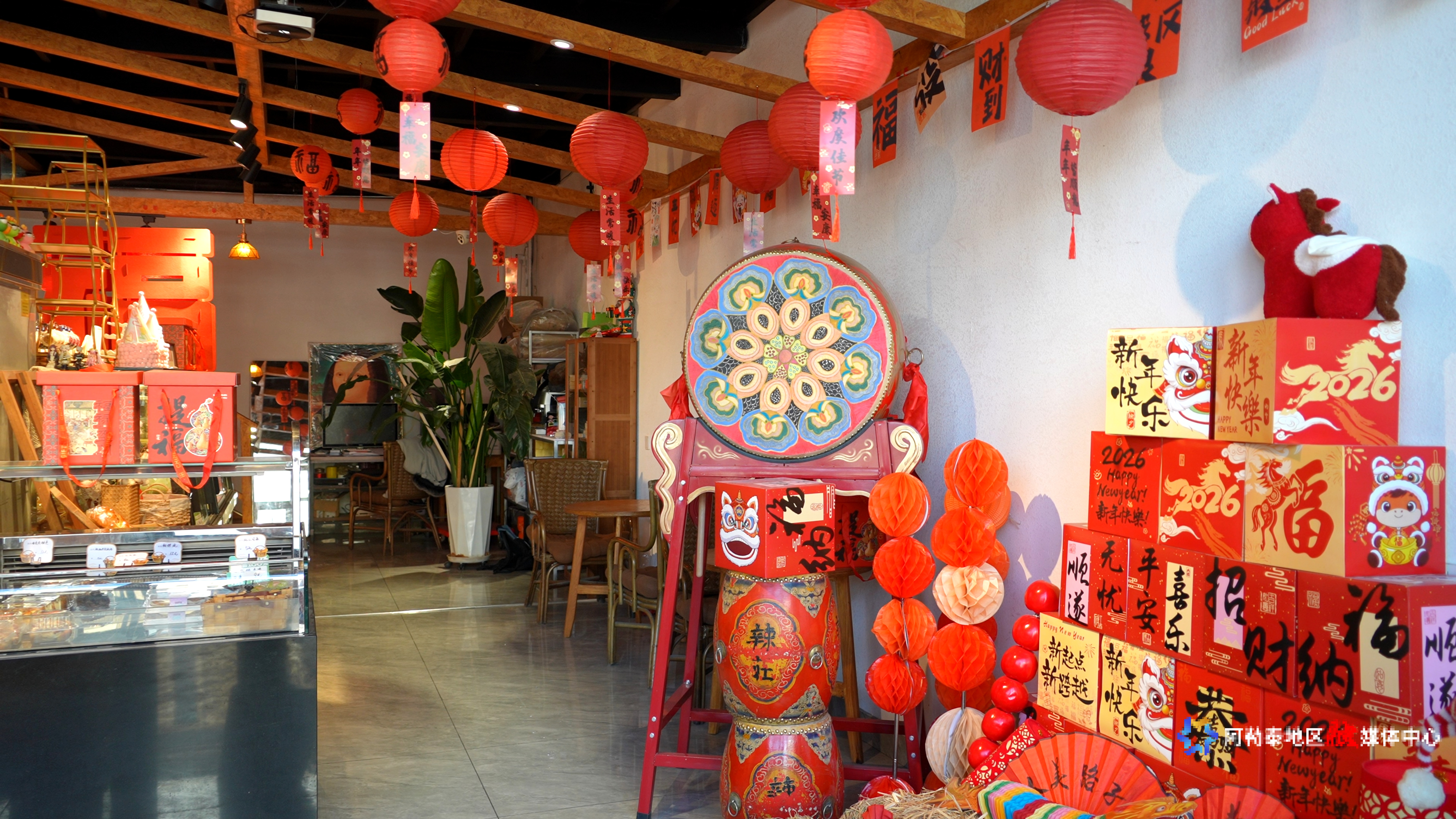 街头年味正浓,沿街商铺也同步开启“新春装扮模式”。走进大型超市、特色餐馆,随处可见浓郁的节日元素:门上贴着春联与“福”字,橱窗挂满五彩拉花与中国结,部分店铺还摆放了马年主题装饰,憨态可掬的生肖造型引得路人纷纷侧目。在一家连锁甜品店里,红灯笼与新春挂饰点缀其间,空气中弥漫着面包香与年味交融的气息。阿勒泰市某蛋糕店店员马玲荣说:“新春限定产品备受青睐,不少市民前来选购年货礼盒,为节日增添甜蜜滋味。”