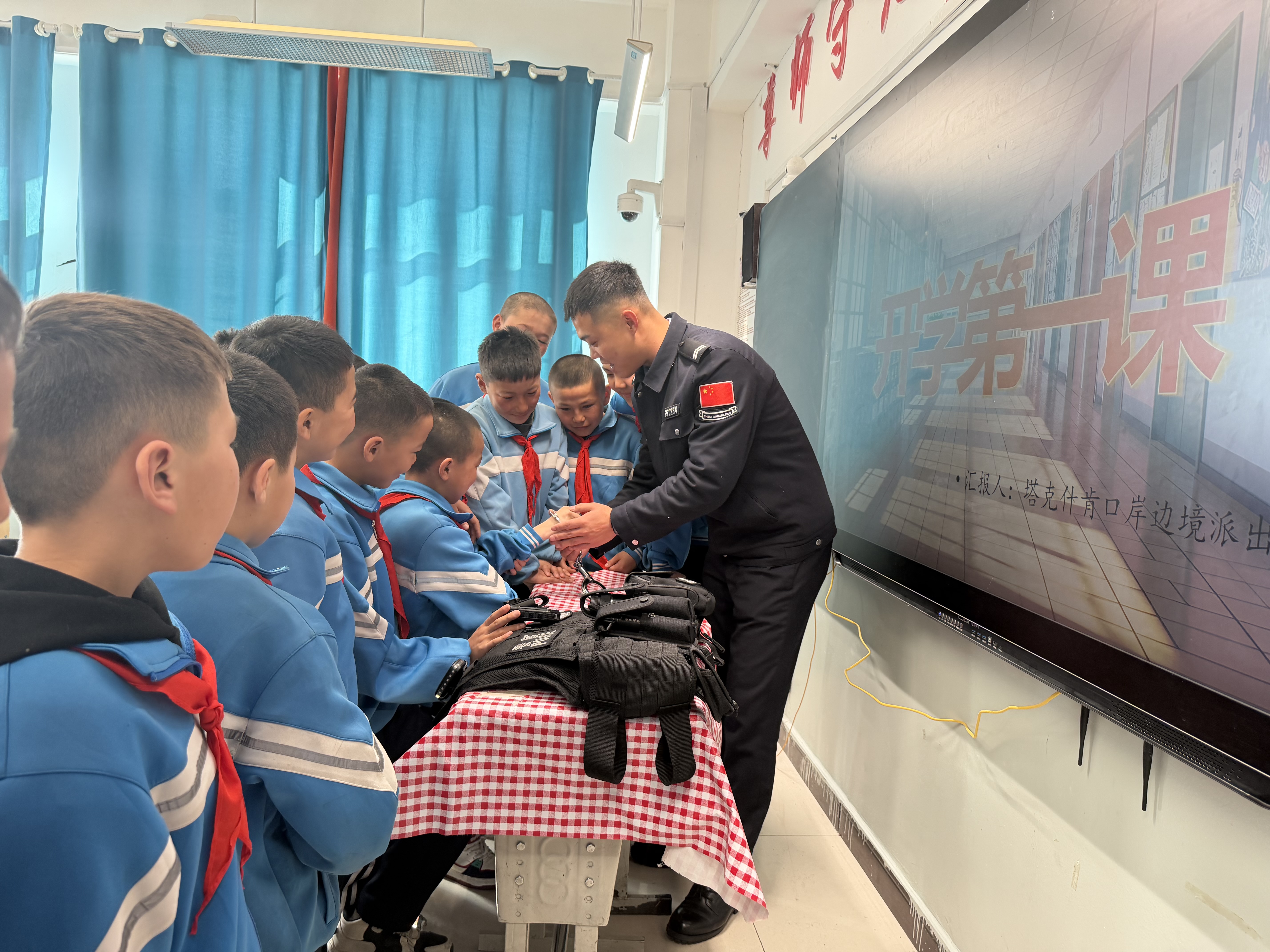 在青河县塔克什肯口岸,边境派出所民警走进驻地校园,开展“开学第一课 法治校园行”主题普法宣传活动,为师生们送上一堂生动实用的法治安全教育课。