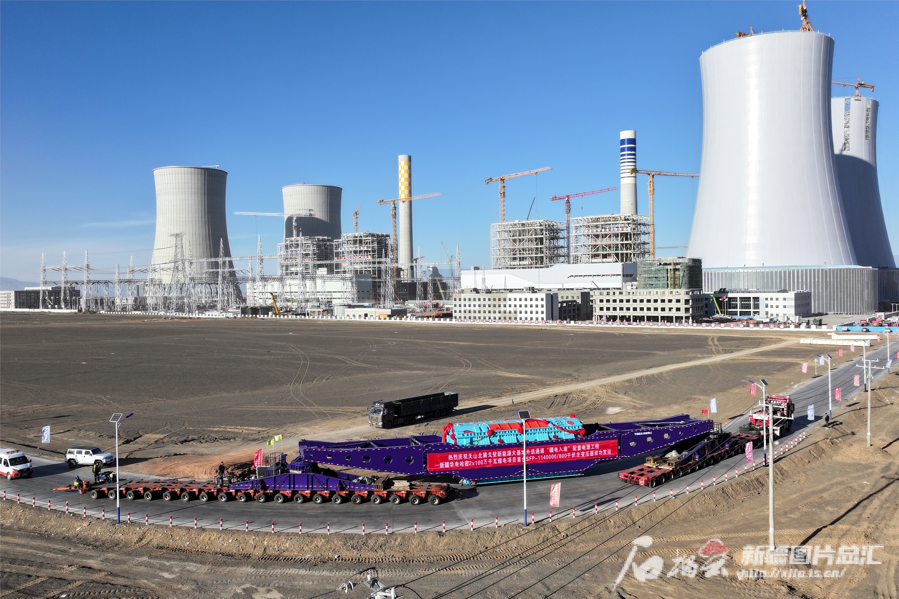 2024年11月5日,“疆电入渝”配套电源工程——新疆华电哈密2*100万千瓦煤电项目首台SFP-1140000/800主变压器从特变电工新疆输变电科技产业园顺利运达位于巴里坤哈萨克自治县三塘湖镇的项目现场。钟卫亮摄
