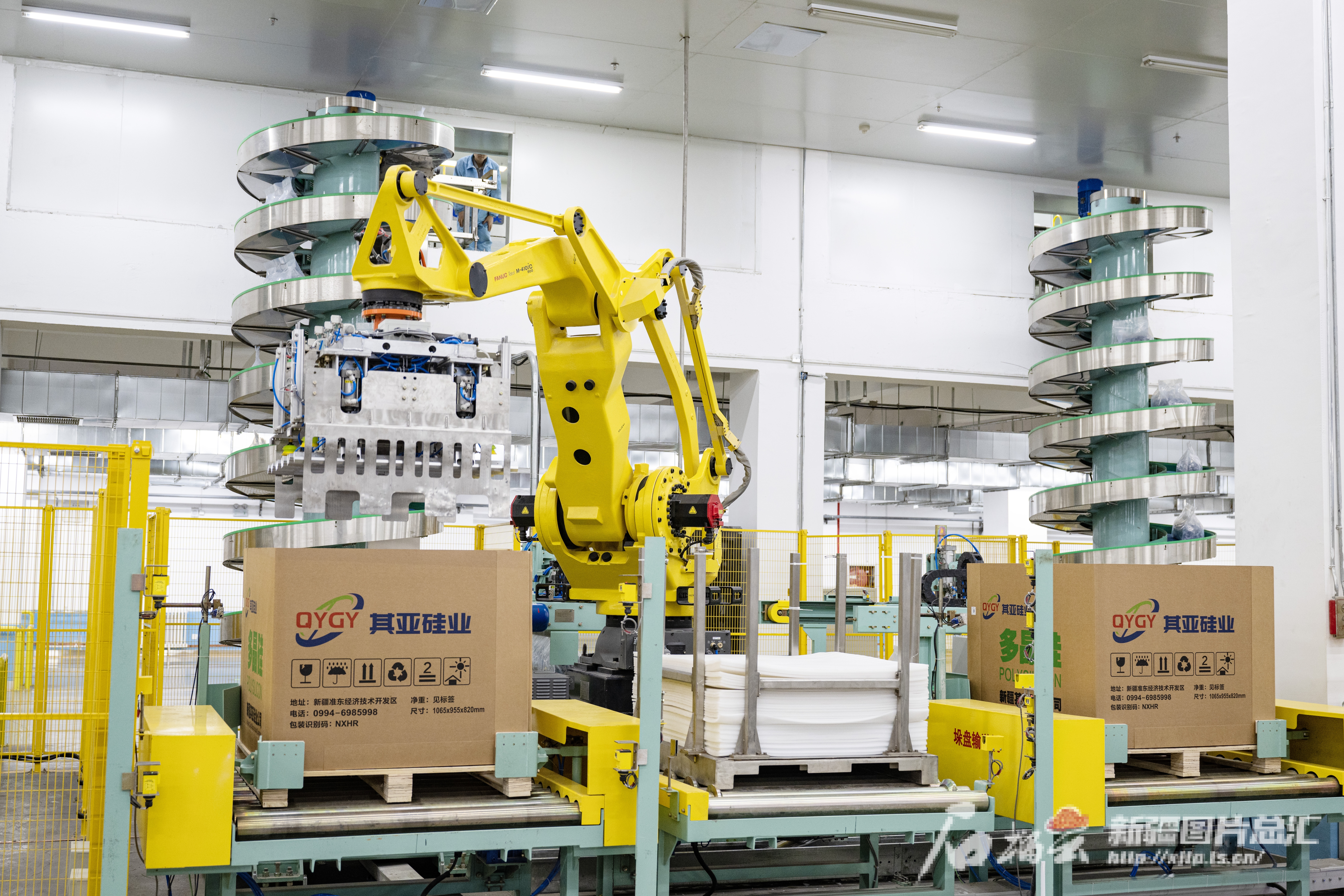 2024年12月28日,位于新疆准东经济技术开发区的新疆其亚硅业有限公司年产10万吨高纯晶硅项目自动化包装车间,设备正在打包多晶硅产品。 何龙摄