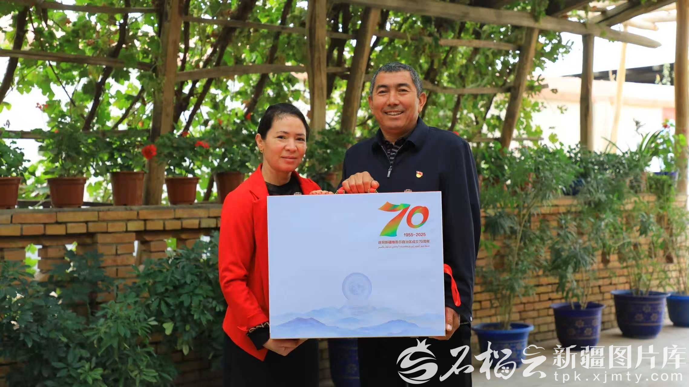 阿卜都克尤木·肉孜和爱人展示中央代表团赠送的礼物。努尔艾力江·图尔贡 摄