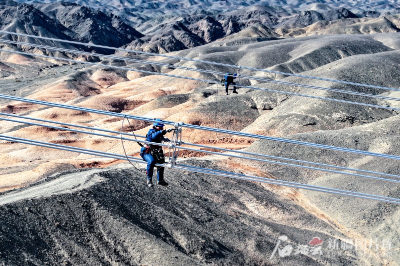工作人员在对哈密-重庆±800千伏特高压直流输电工程的导线间隔棒进行检查。(资料图)图/新疆送变电有限公司提供