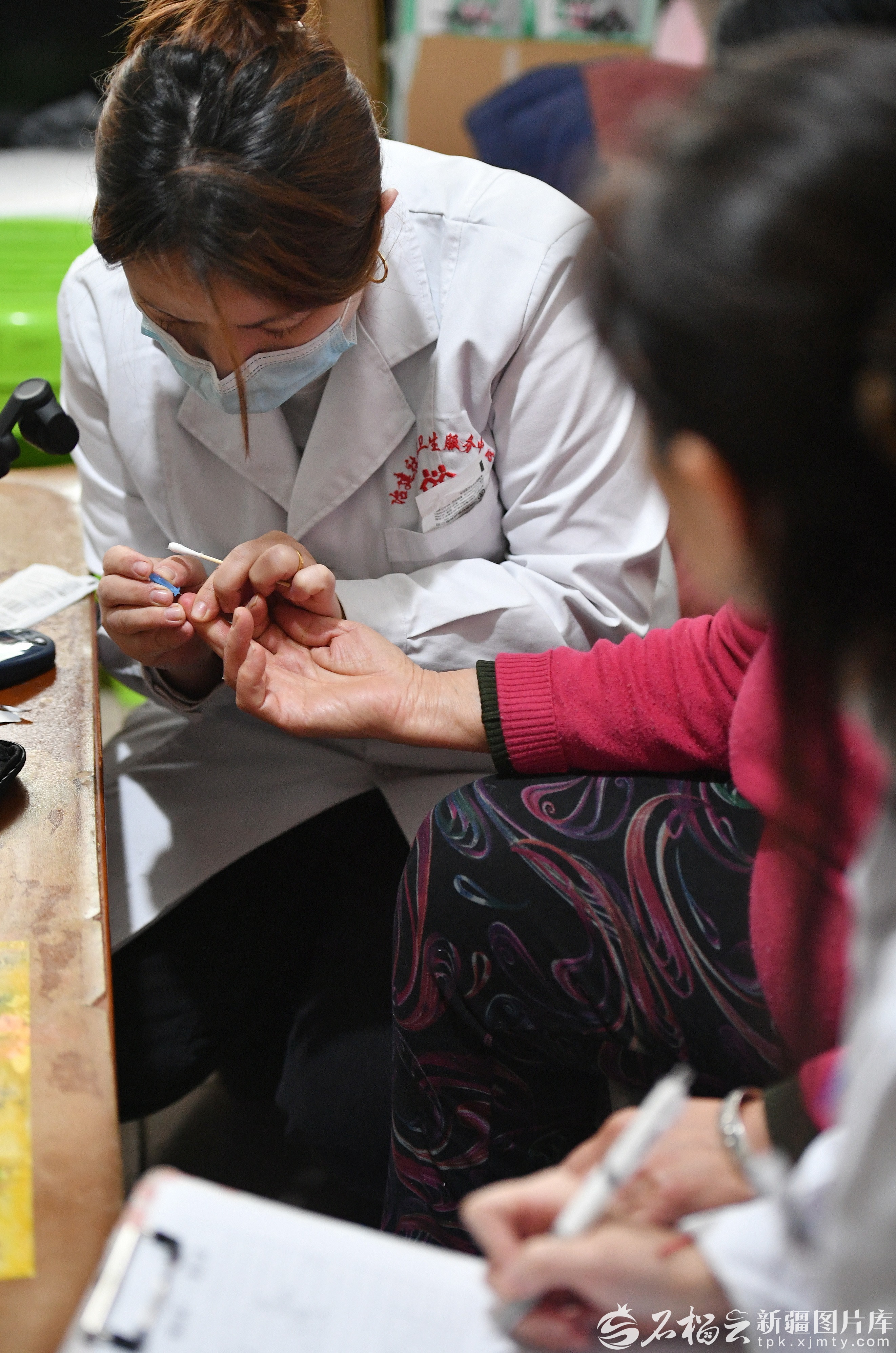2025年11月10日,乌鲁木齐高新区(新市区)冶建社区卫生服务中心工作人员在居民家中测血糖。石榴云/新疆日报记者 邹懿摄