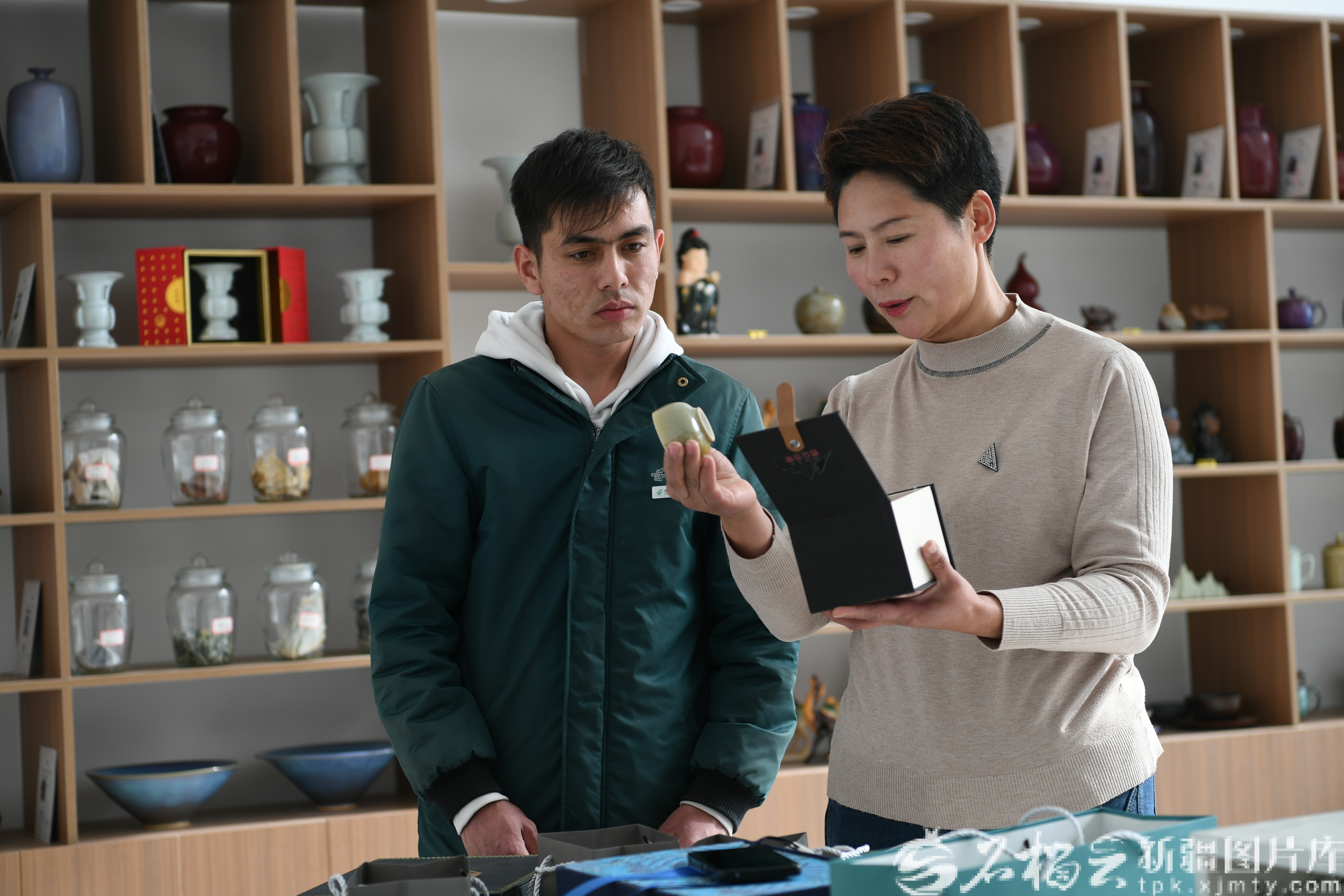 在昆仑玉瓷文化产业园,新疆昆仑玉瓷科技文化有限公司董事长连文娟(右)正在与邮政工作人员对货。天山网-新疆日报记者 拍热扎提·阿不都 摄