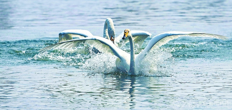 随着生态环境的不断改善,在玛纳斯国家湿地公园越冬的天鹅从最初的30余只增加到1000多只(3月23日摄)。