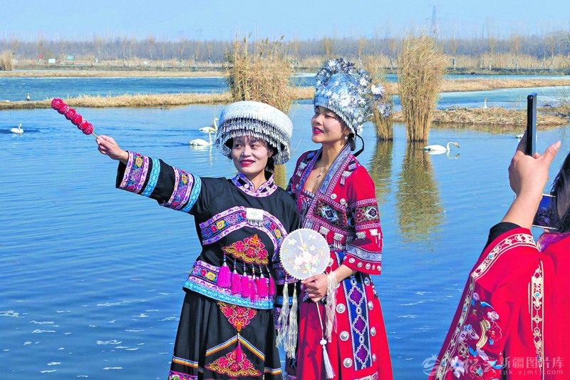3月23日,游客在玛纳斯国家湿地公园拍照留念。