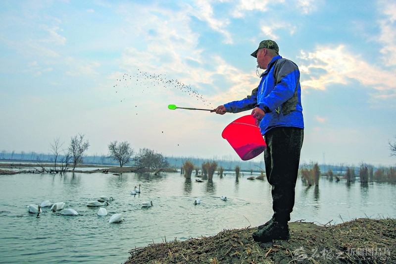 3月24日,管护员为天鹅投喂玉米。每年9月到次年3月,大批天鹅、赤麻鸭等水鸟在湿地停歇,补充能量。