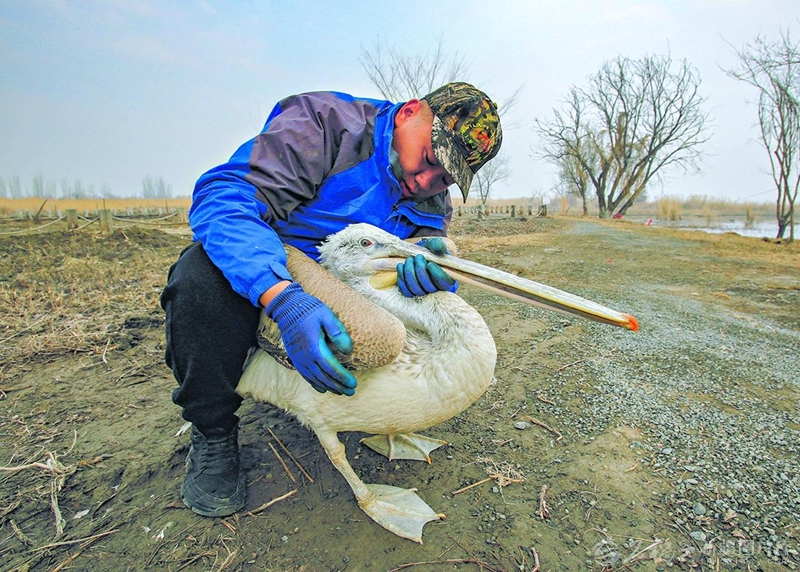 3月24日,管护员在巡护过程中发现一只受伤的鹈鹕,准备带回管护站救治。